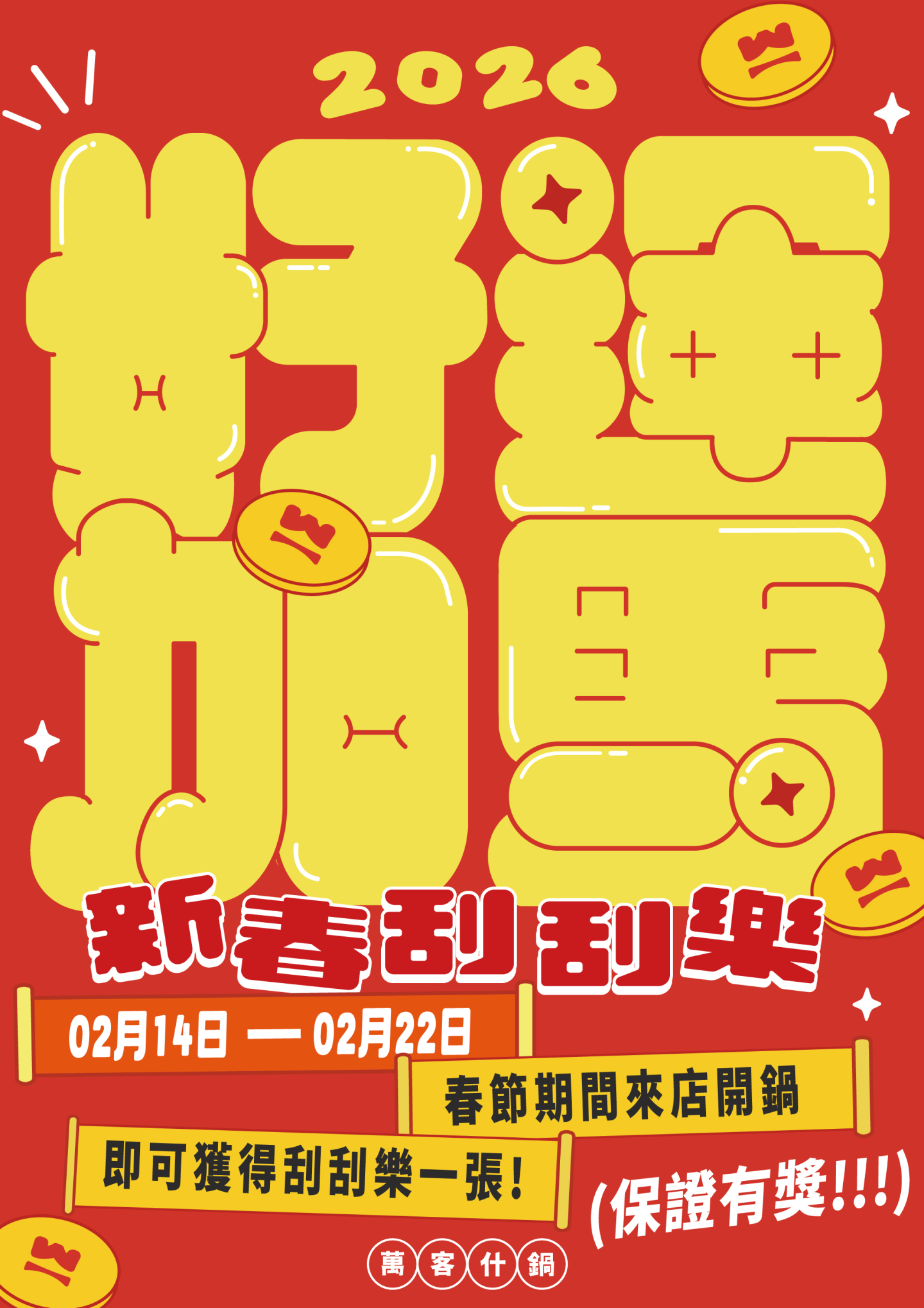 🐎 馬年到!新春好運再加馬~! 2/14-2/22過年期間來萬客什鍋用餐 開鍋就送刮刮樂🧧 開一鍋就送一張!!! 張張都有獎!!! 年節期間出門走春 餓了就來萬客 還能增添新年好運氣..! 有得吃又有得刮 何嘗不是Horse成雙!!!! 萬客祝您新春愉快 馬上賺大錢💰
