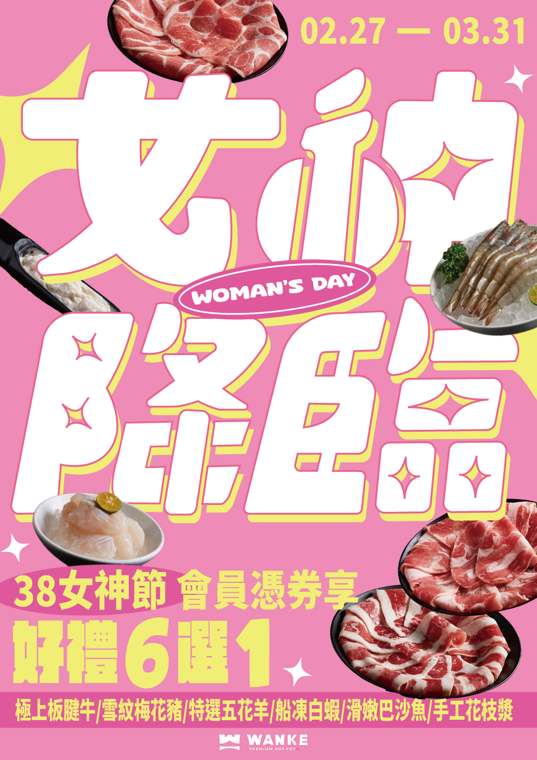 天啊‼️怎麼有女神降臨啦..!沒錯 就是看到這篇貼文的你啊!!38女神節 讓萬客來寵各位女神們💕 2/27-3/31會員只要憑券就享好禮6選1!!!寵女神是要寵一整個月的! 極上板腱牛/雪紋梅花豬/特選五花羊/船凍白蝦/滑嫩巴沙魚/手工花枝漿 要海有海要陸有陸 趕快訂位訂起來!實在不忍心讓我的女神們餓著了🥺